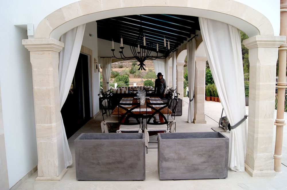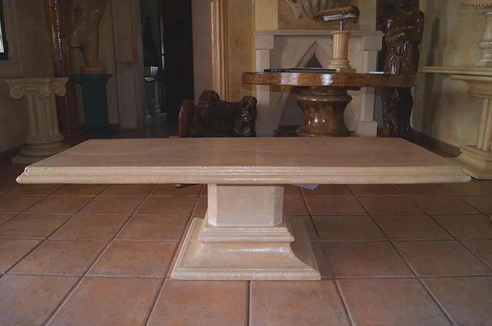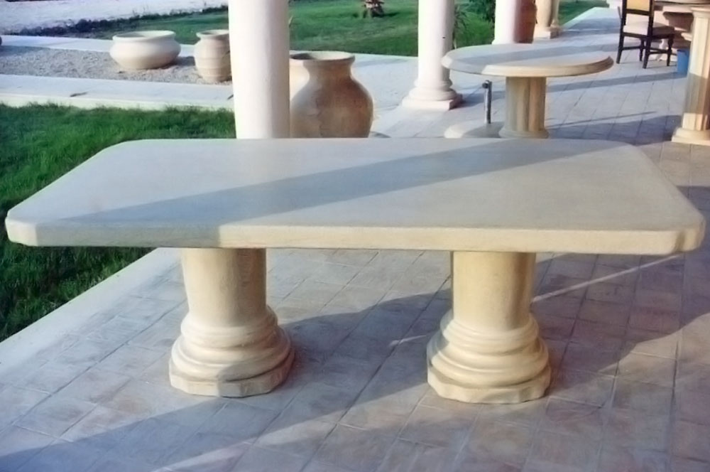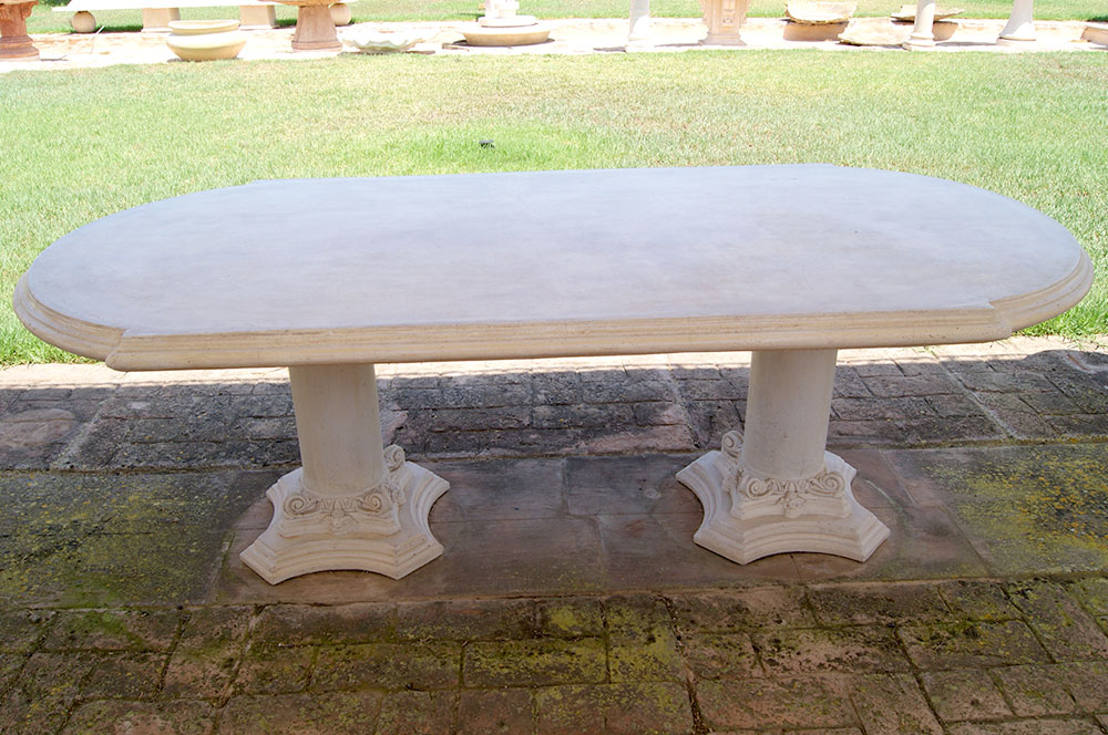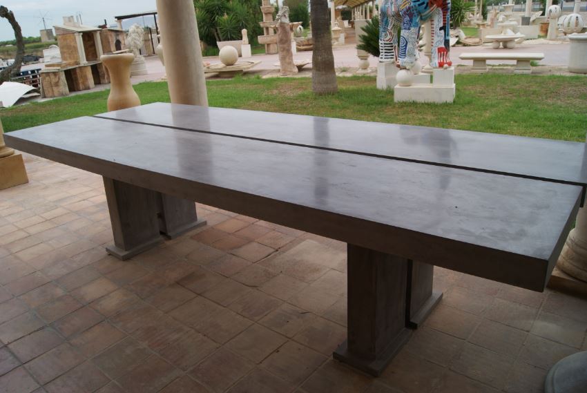 Hechas a medida y a mano, pueden convertirse en una pieza única y exclusiva. El cliente decide la moldura deseada, el modelo de columna y base, el color, acabado…una mesa personificada para cada cliente. Debido a su resistencia al sol, la lluvia, la salitre del mar... son ideales para decorar su jardín, porche o cualquier lugar en el exterior. La longitud máxima de una pieza es de 2,40 de largo, por un metro de ancho. Si el ancho es de 1,10 entonces podemos hacerla hasta 220.