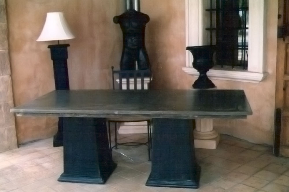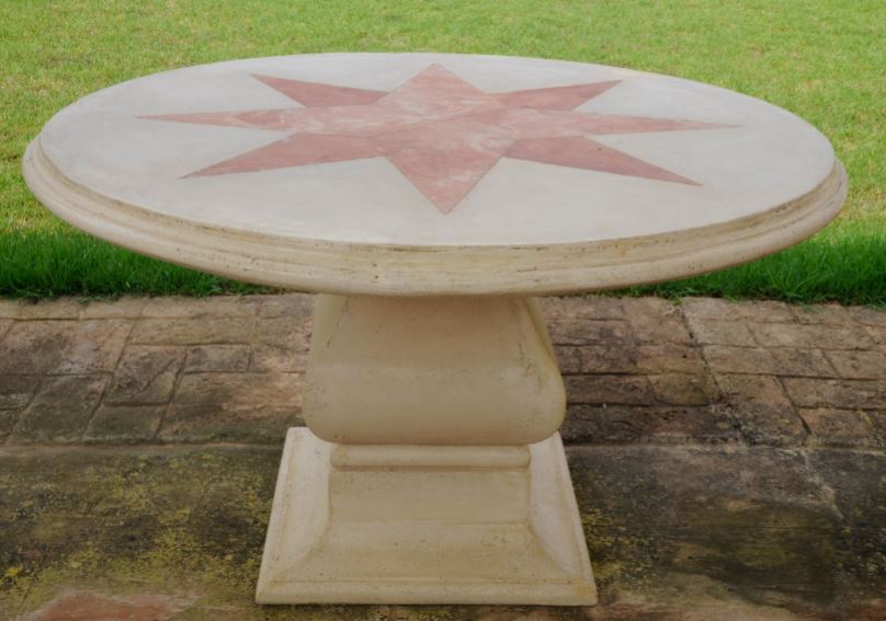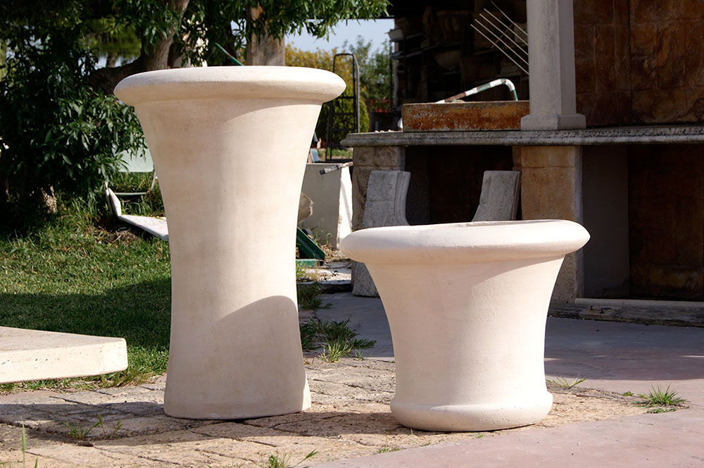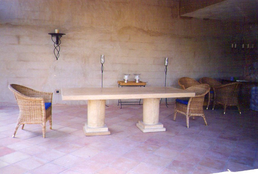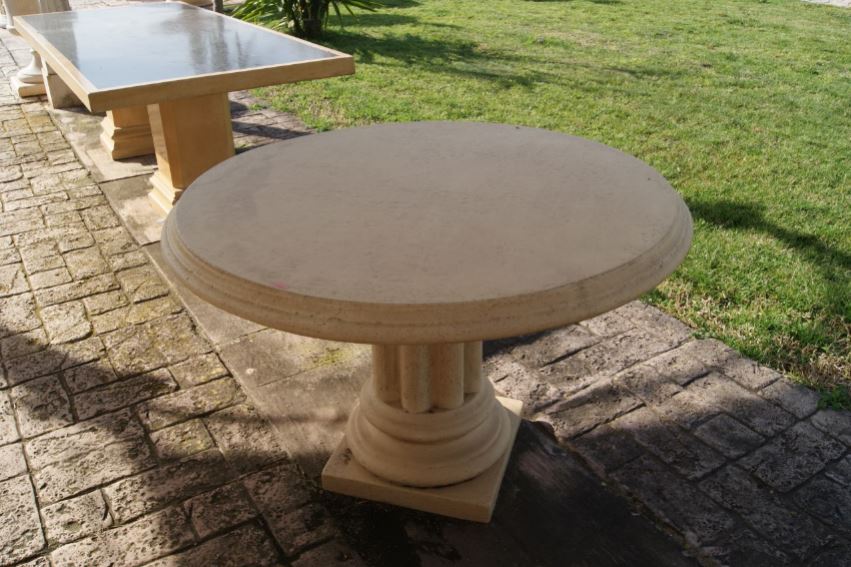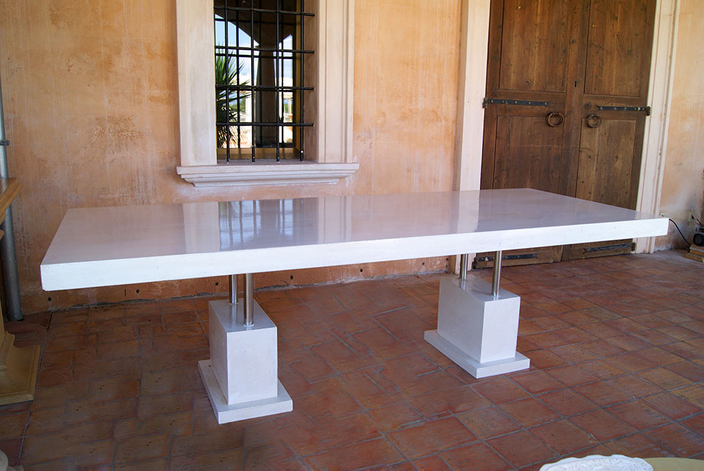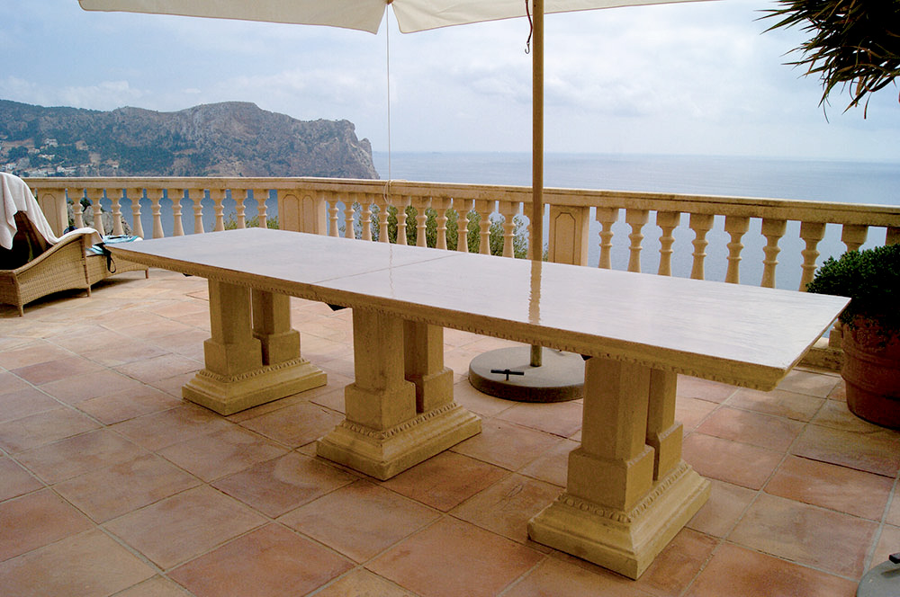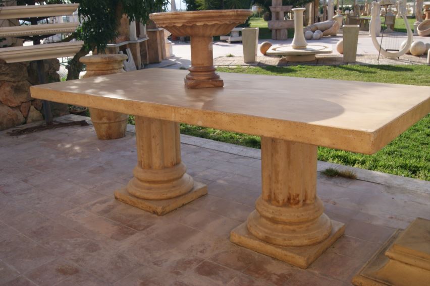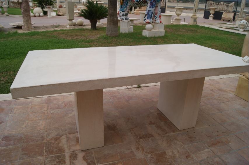 Hechas a medida y a mano, pueden convertirse en una pieza única y exclusiva. El cliente decide la moldura deseada, el modelo de columna y base, el color, acabado…una mesa personificada para cada cliente. Debido a su resistencia al sol, la lluvia, la salitre del mar... son ideales para decorar su jardín, porche o cualquier lugar en el exterior. La longitud máxima de una pieza es de 2,40 de largo, por un metro de ancho. Si el ancho es de 1,10 entonces podemos hacerla hasta 220.